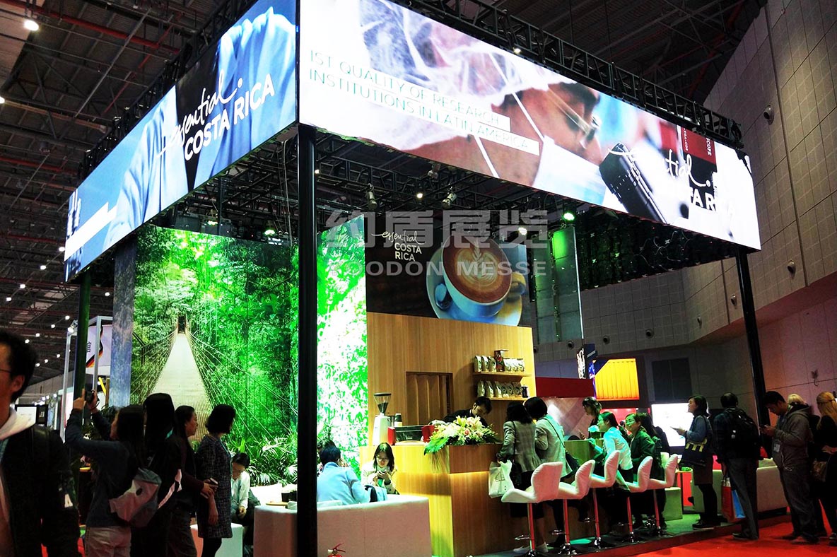 展臺的頂部我們選用了高清的P2.5 LED 屏幕,循環播放哥斯達黎加的自然風情.全LED展示也是近來上海展會設計的一個潮流和風尚.