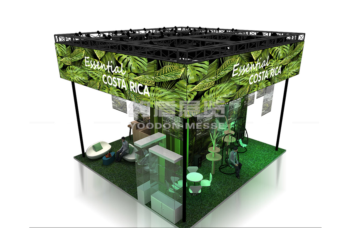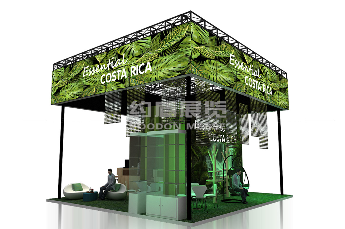 哥斯達黎加國土面積僅占世界陸地面積的0.03%,但擁有全球近4%的物種,是世界上生物物種最豐富的國家之一。26%的國土面積為國家公園或自然保護區,全國森林覆蓋率為52%。因此本次哥斯達黎加國家館在展臺設計搭建中的創意理念就是:沉浸式體驗-哥斯達黎加全方位體驗之旅.